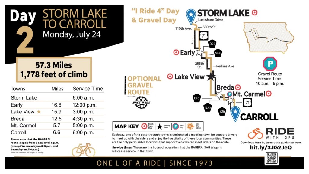 We made decent time the first 18.2 miles to the first pass-through town of Early. Learning from our mistake the day prior, we waited in line for breakfast bowls and recharged in the shade. Our bellies were full, but we also knew we were running low on cash. Most all the vendors were cash only (we knew this would be the case) and had plans to stop at an ATM during the day’s travels. What we didn’t anticipate was that the crowds of riders before us were emptying the ATMs long before we arrived. To put these small towns into perspective, the town of Early had a population of 584 during the last census. Ragbrai multiplied their population by more than 50 times that during the few hours the event rolled through- often depleting them of both food and cash.